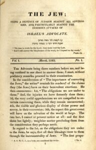 It is perhaps no surprise that the notice for The Jew appeared in The National Advocate, owned by Naphtali Phillips (1773-1870), the first Jew in America to publish and edit a general interest newspaper. He also wrote a history of Congregation Shearith Israel. Later, Mordecai Manuel Noah worked for his uncle, Naphtali Phillips, as editor of The National Advocate for a number of years until he resigned in 1826; thus, the legal notice for The Jew was published under Noah’s tenure at the newspaper. It appears that in the 1820s, Jewish publishers played a significant role in both general life and in Jewish matters in the United States, particularly in New York, yet despite their prominence, Jews nonetheless needed to counter missionary activity. Thus, Jews were in the unenviable position of needing to defend themselves, yet in the enviable position, rare at that time in the world, of having sufficient resources and freedom of speech to do so.